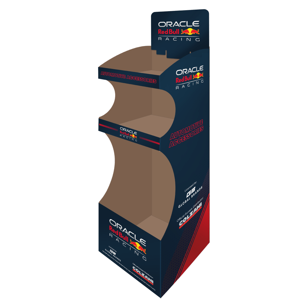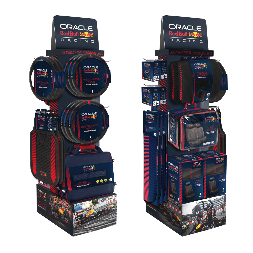 Our Red Bull Racing™ displays are engineered to capture the energy of the racetrack and translate it directly onto the sales floor. Each unit features: Bold Team Graphics & Color Blocking: Authentic Oracle Red Bull Racing™ logos, carbon-fiber pattern accents, and team-color side panels for instant brand recognition.